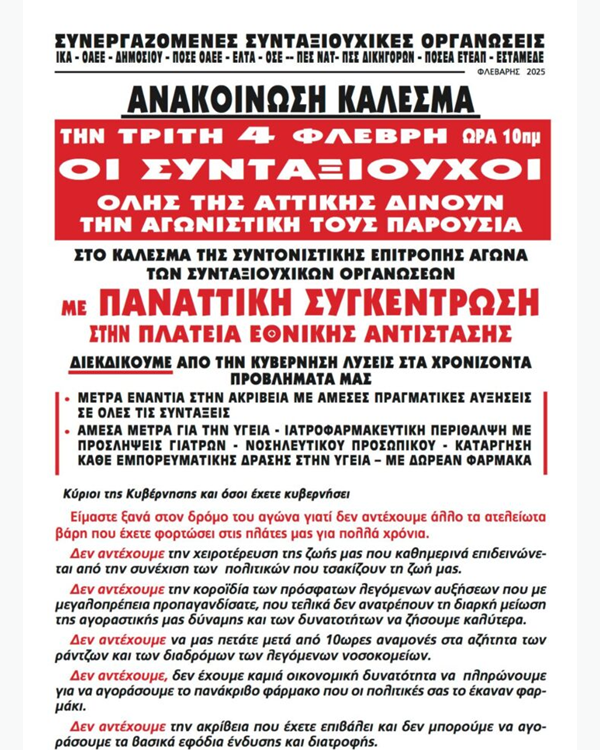 Οι συνταξιούχοι ενώνουμε τις δυνάμεις μας με τους εργαζόμενους συμμετέχοντας στην μεγάλη πανεργατική συγκέντρωση στο Σύνταγμα στις 11 π.μ. διεκδικώντας: