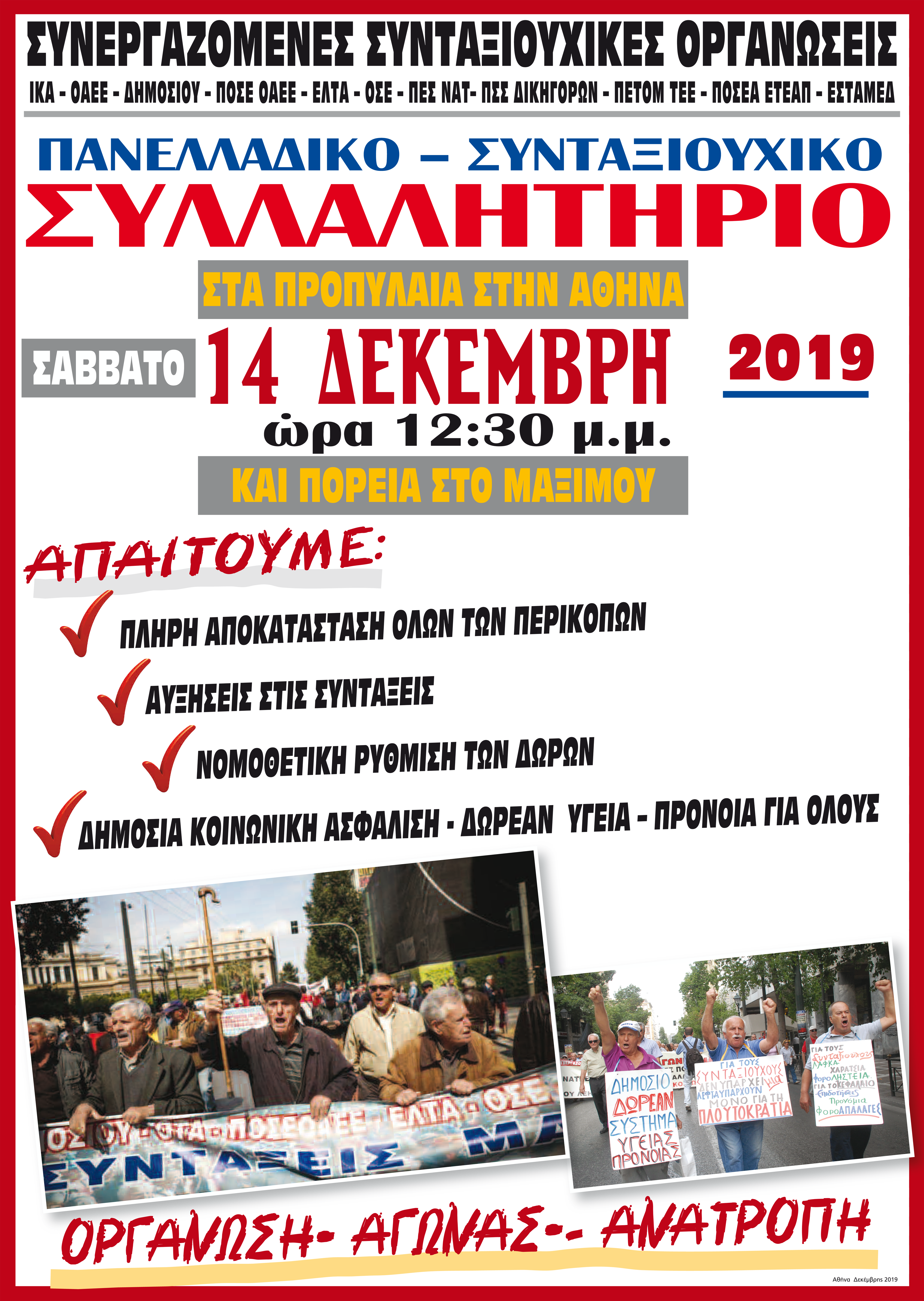 Οι Συνταξιουχικές Οργανώσεις πραγματοποιούν Παναττική συγκέντρωση ημέρα Τρίτη 14 Φλεβάρη ώρα 10.30 π.μ στα Προπύλαια. Ανάλογες συγκεντρώσεις θα πραγματοποιηθούν σε όλες τις περιοχές της χώρας